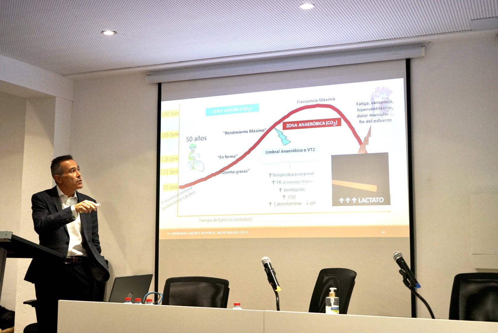 La 1a mesa fue inaugurada por mí, sobre el tema “Corazón y Deporte ¿Hay límites?”, en los que trate sobre 6 cuestiones que se plantean habitualmente en una consulta de cardiología deportiva: a) respuesta del corazón a un esfuerzo física, es decir, los cambios adaptativos del corazón; b) qué tipo de ejercicio es bueno para nuestro corazón; c) caminar y corazón (“power-walking”); d) qué hay de cierto con el tema de los pasos a realizar a diario; e) pulsaciones adecuadas con los esfuerzos físicos; f) necesidad de realizarse reconocimientos cardiológicos en los deportistas. Contesté a preguntas de la audiencia en relación con la tan temida muerte súbita en el deporte.