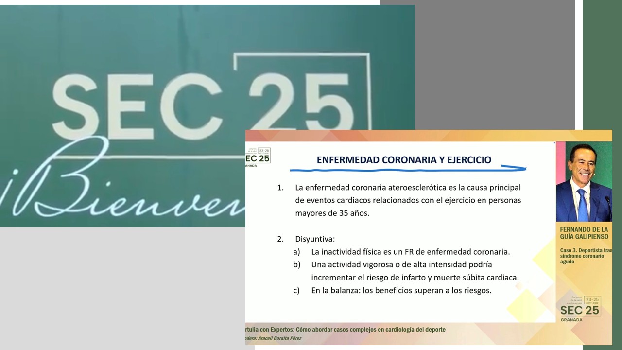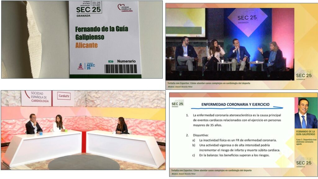 Se ha celebrado en Granada el Congreso de la Salud Cardiovascular de la Sociedad Española de Cardiología (SEC) (23-25 octubre 2025). Fui invitado a participar como ponente en la Tertulia: «Cómo abordar casos complejos en cardiología del deporte», junto a la Dra. Araceli Boraita como moderada, y los Dres. Leonel Diaz (miocardiopatía hipertrófica), Dra. María Sanz de la Garza (miocarditis), y en mi caso: enfermedad coronaria.