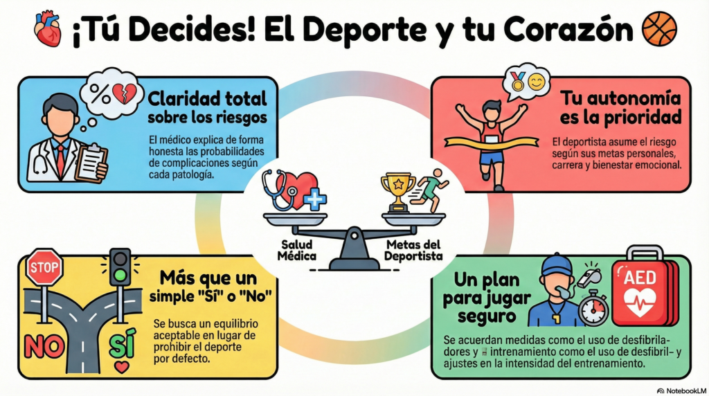 Cierro con un cambio de paradigma: dejamos de preguntar “¿puede hacer deporte?” para preguntarnos “¿cuál es el riesgo real de este paciente en su deporte concreto?”. La clave es la toma de decisiones compartidas, donde se combinan salud médica, metas del deportista y medidas de seguridad (desde DEAs hasta ajustes de intensidad) para construir un plan aceptable y sostenible.