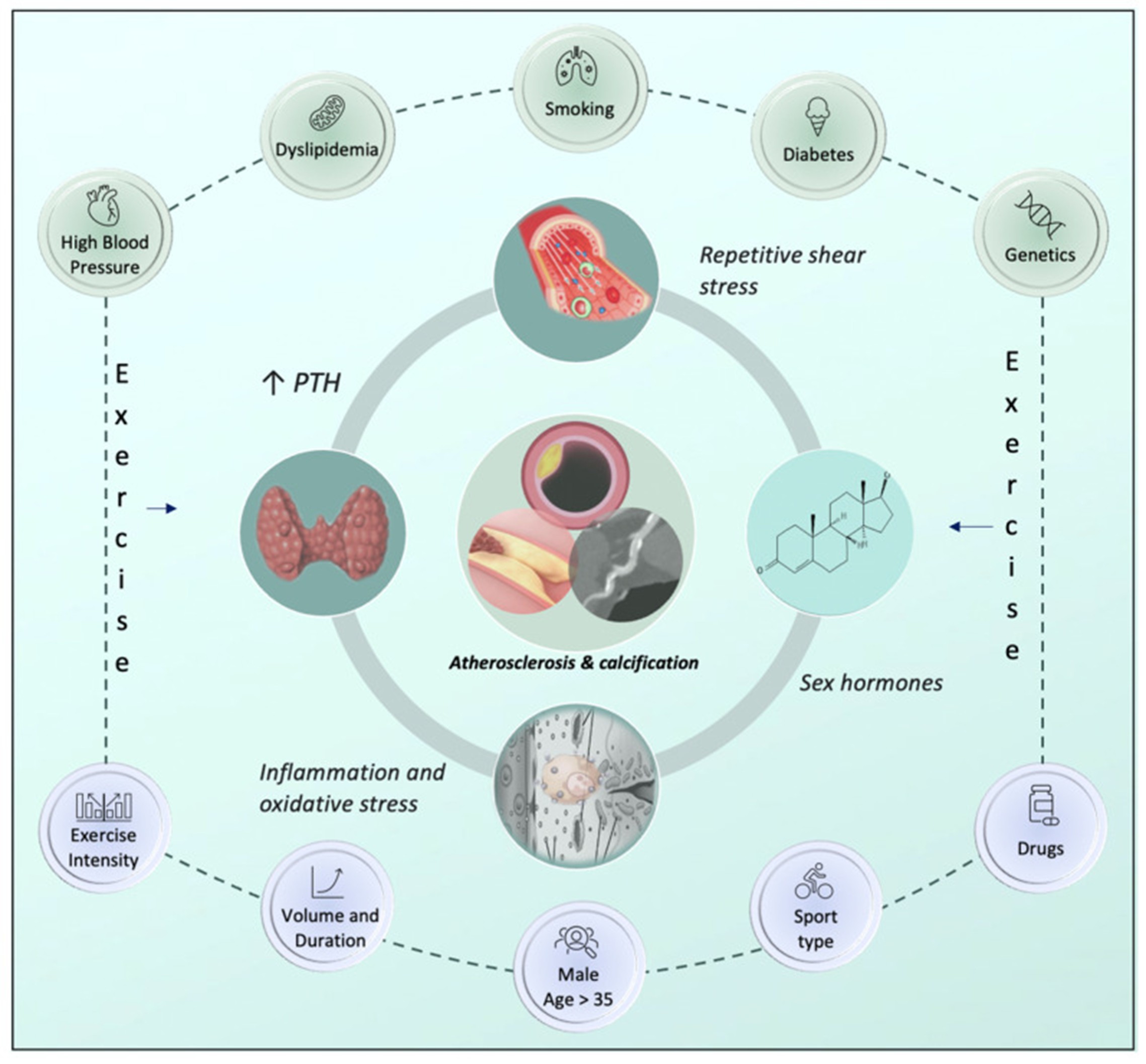 En la siguiente tabla quedan reflejados los diferentes mecanismos de la aterosclerosis coronaria relacionada con el ejercicio en deportistas. Numerosos factores están relacionados, desde un daño endotelial y un persistente estrés de la pared coronaria, la ingesta dietética, el estrés psicológico, el uso de medicamentos antiinflamatorios y la inflamación crónica (mayor liberación sistémica de citocinas y marcadores proinflamatorios), la genética aterosclerótica subyacente, la presencia de factores de riesgo CV establecidos, el aumento de la hormona paratiroidea (PTH) y la generación de un estado proinflamatorio agudo durante el ejercicio intenso, que podrían explicar el proceso aterosclerótico en atletas.