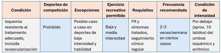 Las directrices americanas ACC/AHA establecen que es razonable prohibir a los deportistas con EAC clínicamente manifiesta participar en deportes competitivos durante un mínimo de tres meses después de un IM, o un procedimiento de revascularización coronaria, o si sus síntomas de isquemia miocárdica están empeorando o son más frecuentes.