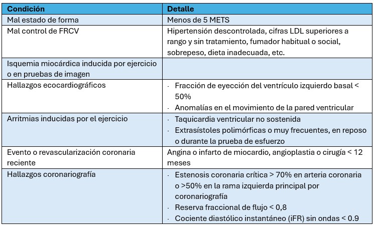 Las personas que quieran incorporarse a la vida activa y realizar nuevamente actividad deportiva, incluso competitiva, deben conocer que hay una serie de CONDICIONES que pueden hacer que esa decisión quede detenida. La estratificación de riesgo de los deportistas queda reflejada en la siguiente tabla.