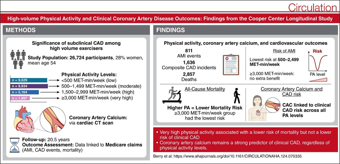Un estudio recientemente publicado en Circulation 2025 aporta datos que pueden aumentar las incertidumbres, al concluir que, en comparación con la actividad física de bajo volumen, la actividad física de alto volumen se asoció con un menor riesgo de mortalidad por cualquier causa, pero con un riesgo similar de enfermedad coronaria clínica. El CAC se asoció con un mayor riesgo de enfermedad coronaria clínica, independientemente del volumen de actividad física, es decir, más controversia a este apasionante tema.