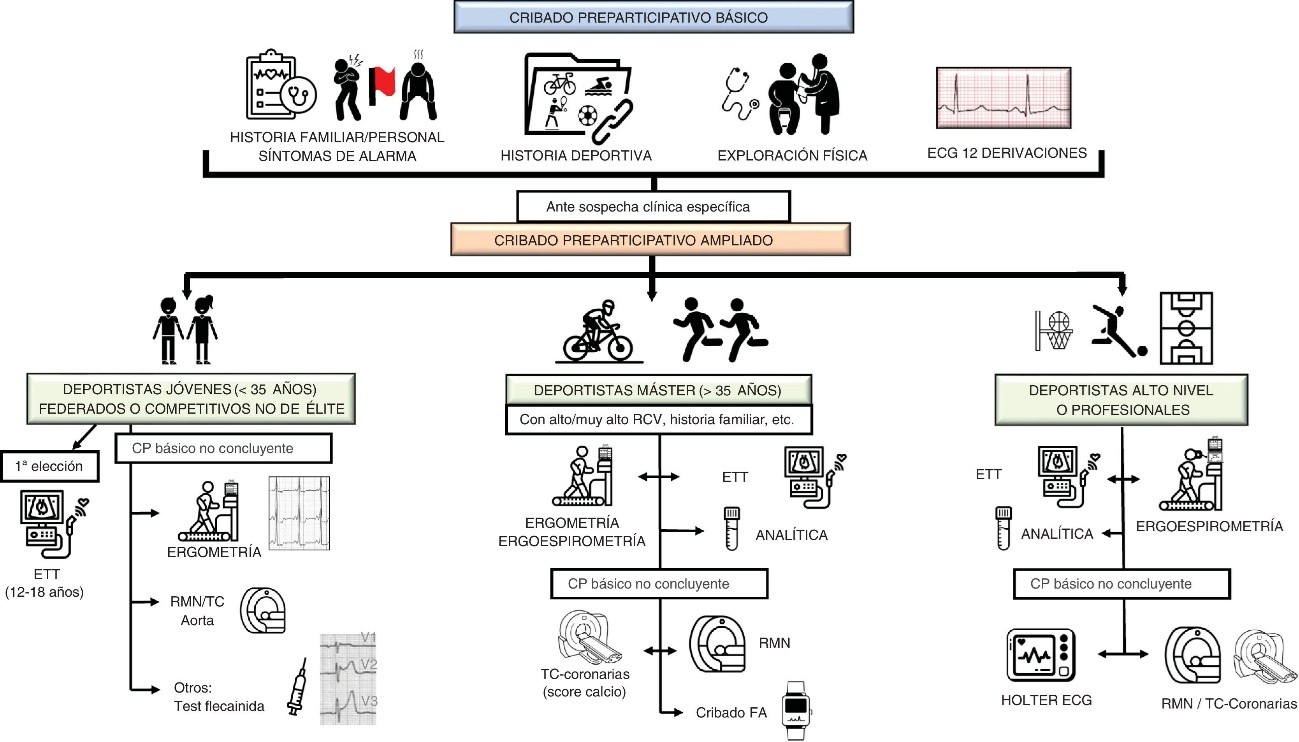 El grupo de trabajo de cardiología del deporte de la Sociedad Española de Cardiología publicó una revisión sobre que pruebas dentro del cribado preparticipativo básico y ampliado se deberían practicar en los diferentes tipos de deportistas, agrupados por edades, tipo de deportes, etc., que os recomiendo revisar, con unos gráficos muy explicativos que os dejo en este post.