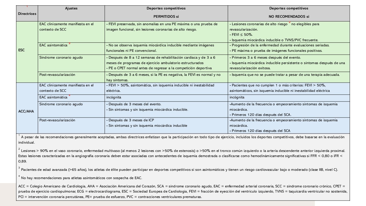 Las directrices americanas ACC/AHA establecen que es razonable prohibir a los deportistas con EAC clínicamente manifiesta participar en deportes competitivos durante un mínimo de tres meses después de un IM, o un procedimiento de revascularización coronaria, o si sus síntomas de isquemia miocárdica están empeorando o son más frecuentes.